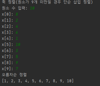 그래서 다음 코드는 원소 수가 9개 미만일 경우에는 단순 삽입 정렬을 하고