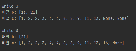 세 번째 while문도 배열 b에 남아있는 수들을 배열 c에 넣어주는 것입니다.