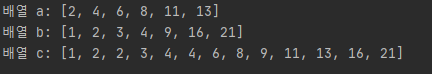 출력되는 결과를 보면 계속 배열 a,b를 비교해 더 작은 수를 배열c에 넣는 것을 알 수 있습니다.