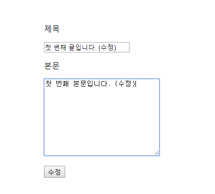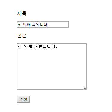 이렇게 기존의 글 내용을 보여주며 수정할 수 있는 페이지가 나옵니다.