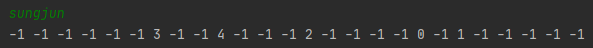 각각의 알파벳에 대해서, a가 처음 등장하는 위치, b가 처음 등장하는 위치, ... z가 처음 등장하는 위치를 공백으로 구분해서 출력한다. 만약, 어떤 알파벳이 단어에 포함되어 있지 않다면 -1을 출