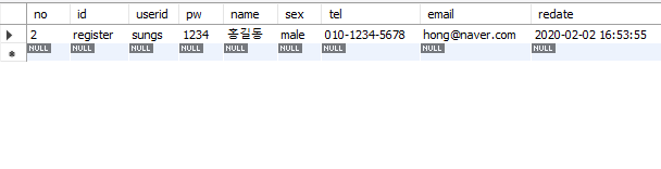 (id, userid, pw, name, sex, tel, email, redate) /*이 부분은 DB 테이블에서 만든 이름과 똑같이 입력해줍니다.*/