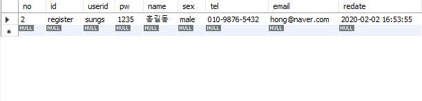 그리고 업데이트 문으로 register 테이블에서 수정할 pw와 tel 지정해줍니다.