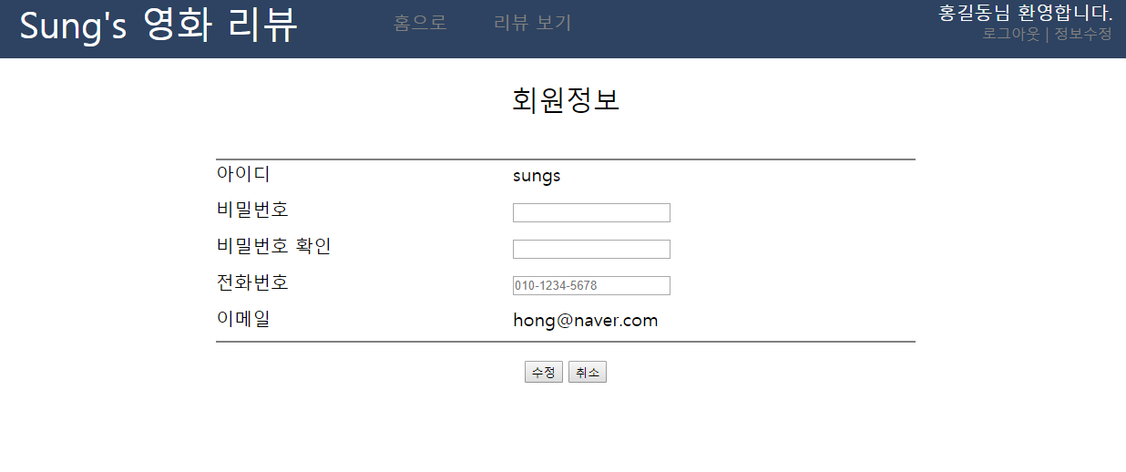 다시 정보수정을 하고 로그인 표시가 뜨는지 확인해봅시다.